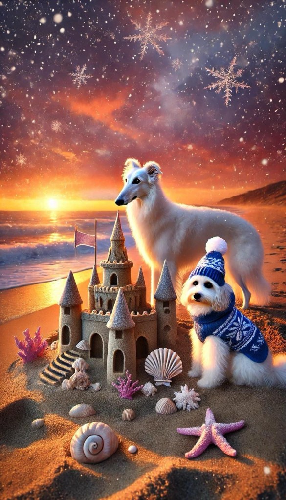 Blossom, the elegant white Borzoi with her silky fur flowing in the cold breeze, pranced gracefully along the shoreline. Her pawprints left delicate trails in the frosted sand. Beside her trotted Ariel, the cheerful white Maltipoo, wrapped snugly in a tiny blue sweater with a matching pom-pom hat.